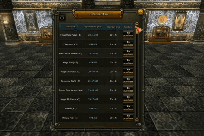 Listede, her itemin yanında oyunun talep ettiği Noah miktarı yer alır. Eğer bu miktar envanterinizde bulunuyorsa, “Repurchase” butonuna tıklayarak iteminizi geri alabilirsiniz.