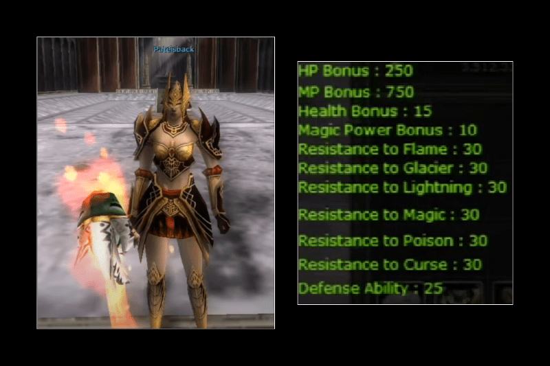 Öncelikle, seti tam set olarak giydiğinizde karakteriniz önemli bonuslar kazanır. Bu kullanımda 250 HP, 750 MP, 15 Health, 10 MP, 25 defans elde edersiniz. Bununla birlikte, Flame, Glacier, Lightning, Magic, Poison ve Curse türlerinde +30 resist bonusu da sağlanır. Bu değerler mage için oldukça dengeli bir yapı sunar.